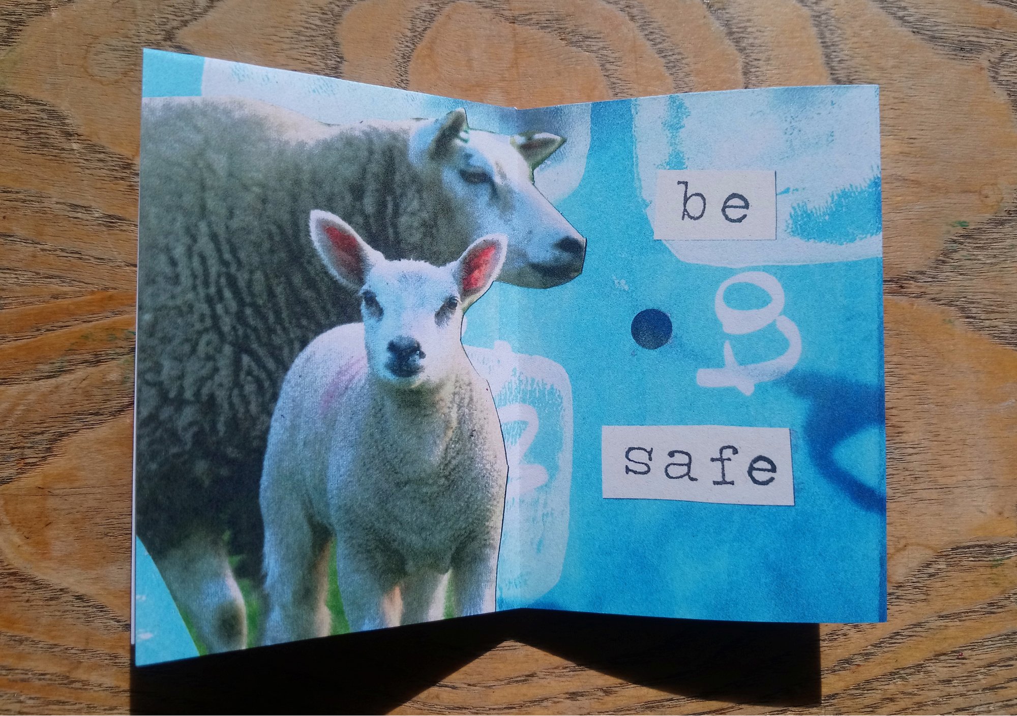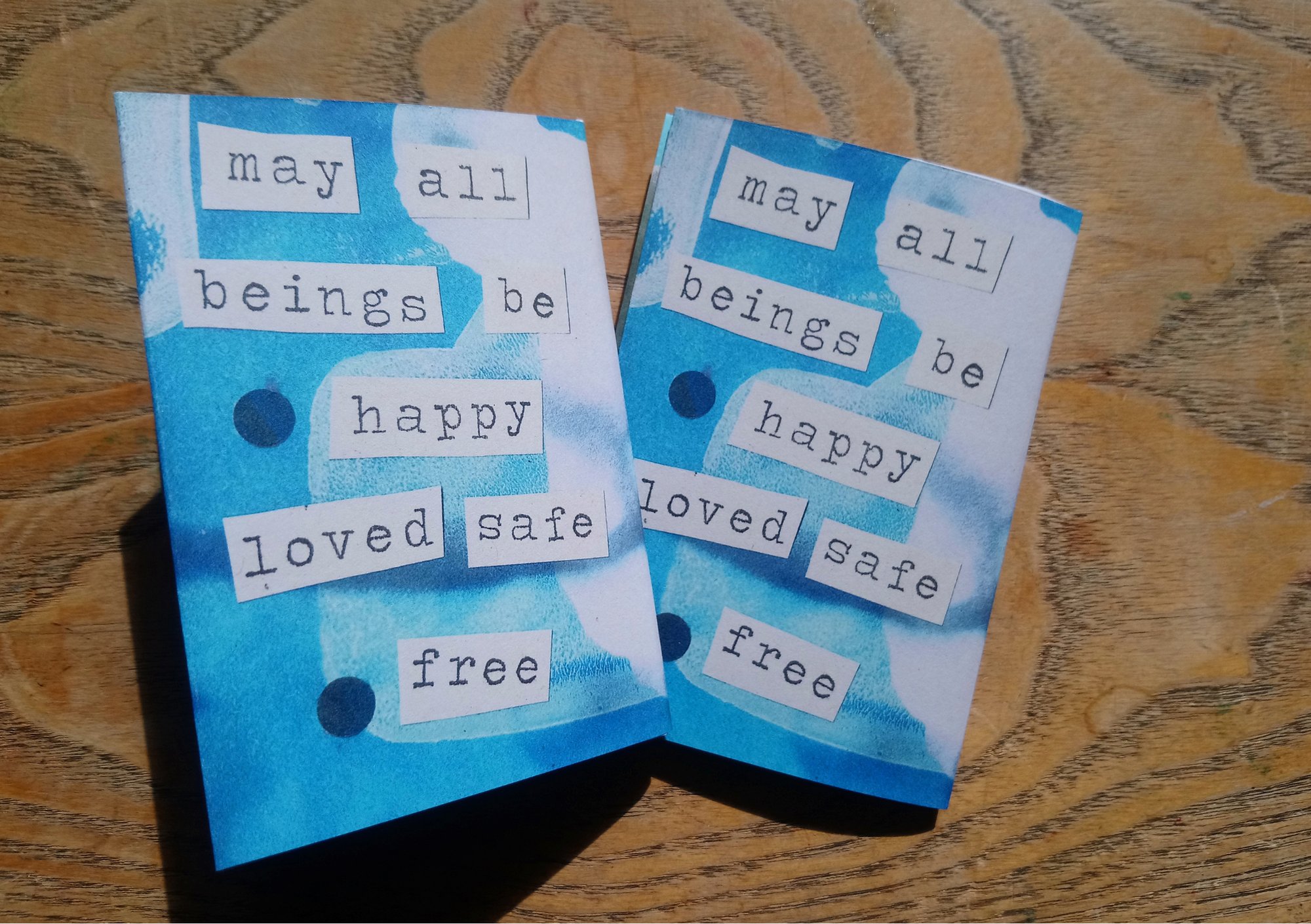 May We All is a tender collaged mini zine carrying simple messages of loving-kindness (or metta) offered by gentle animal beings. Each phrase is hand-stamped and collaged onto a soft blue backgroun, which was created using a handmade cyanotype (sun-printing) process.